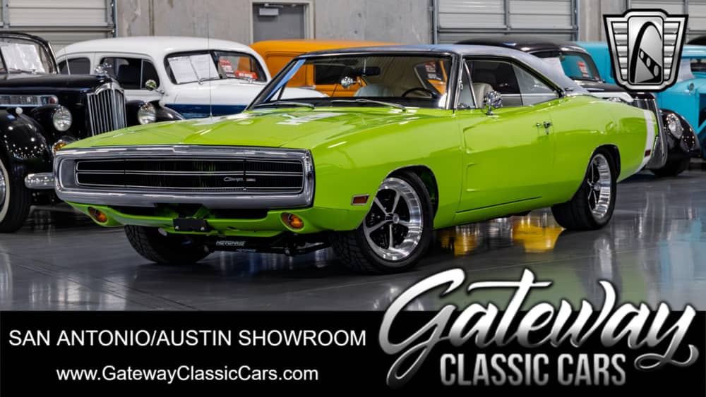 Gateway Classic Cars of San Antonio/Austin is excited to present this 1970 Dodge Charger, finished in the factory Mopar Sublime Green with a black vinyl top exterior that captures the essence of its era. Under the hood lies an all-aluminum 528ci EFI HEMI with a mild Hot Street cam and Holley high-performance EFI full sequential fuel-injection system, dyno sheet shows 670hp and 660 ft/lbs of torque, all backed by a TorqueFlite 727 automatic transmission. It features a Strange Dana 60 S-Trac rear end with 3.54 gears, a full Hotchkis TVS suspension system, QA1 tubular K-Member, Borgeson steering box and Viper Brembo 4-wheel disc brakes. It also has a custom stainless-steel gas tank and full TTI 3" exhaust system with polished ceramic headers, X-pipe and factory-style stainless-steel tips. Step inside to discover a distinctive black and white interior that complements the vibrant exterior. The vinyl seats provide a classic look and feel, while the inclusion of seat belts ensures a touch of modern safety. The cabin is equipped with an AM radio, offering a nostalgic nod to the past and a simple yet effective way to enjoy your favorite tunes as you cruise down the highway. This Charger is fitted with performance tires, enhancing its grip and handling capabilities, making it a true performer on the road. Whether you're a collector of classic cars or a muscle car enthusiast, this 1970 Dodge Charger represents a unique opportunity to own a piece of automotive history. Its combination of iconic styling, powerful performance, and timeless appeal make it a standout choice for those who appreciate the legacy of American muscle cars.
